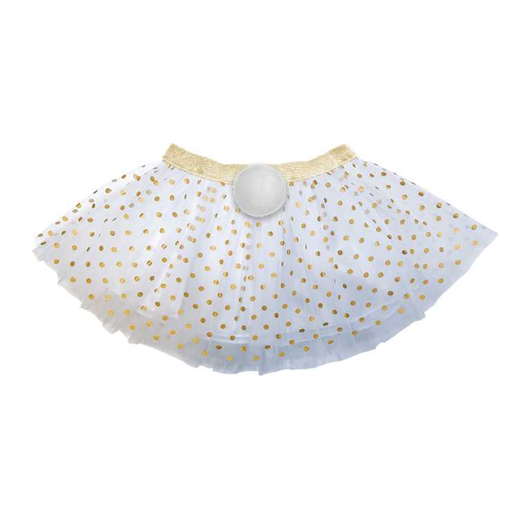 This charming Gold Polka Dot Tulle Skirt combines elegance and fun in one delightful piece. Featuring soft white tulle adorned with shimmering gold polka dots, it's perfect for adding a touch of sparkle to any outfit. The skirt is finished with a gold waistband and a fluffy pom-pom detail at the center, giving it an extra whimsical charm. Ideal for any occasion that calls for a bit of glimmer and glamour, this skirt offers both comfort and style with its soft, breathable material and elastic waistband.