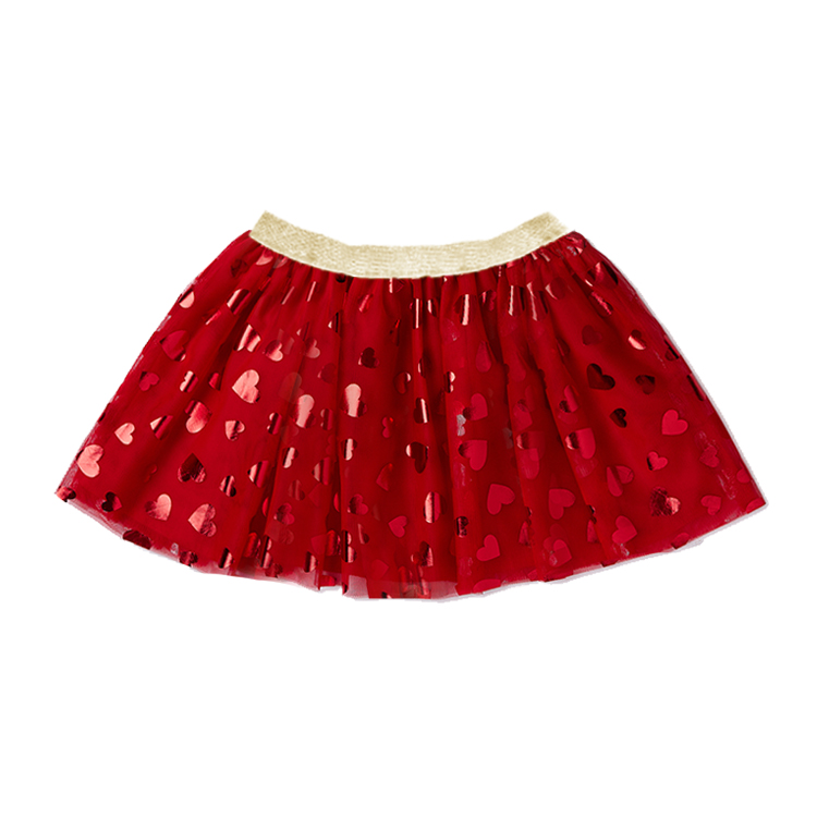 Celebrate love and joy with the Red Heart Sparkle Tulle Skirt. Designed with layers of vibrant red tulle and adorned with shimmering metallic heart patterns, this skirt is full of charm and festive spirit. The soft, stretchy gold waistband adds a touch of glam and ensures a comfortable fit for all-day twirling.