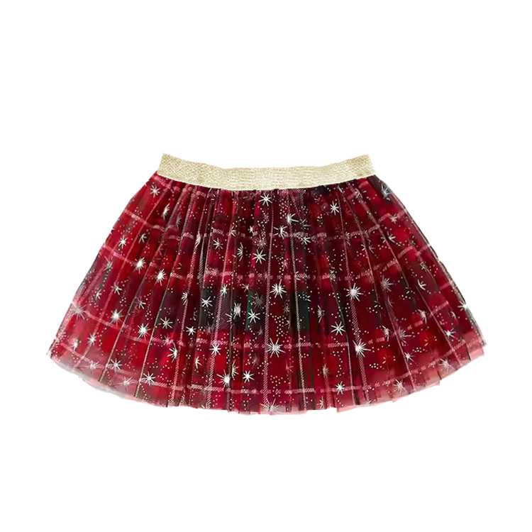 A stunning and celebratory skirt perfect for the holiday season! This vibrant red tulle skirt features a classic plaid pattern overlaid with shimmering white stars, creating a magical and festive look. The gold elastic waistband adds a touch of elegance, making it ideal for special occasions.