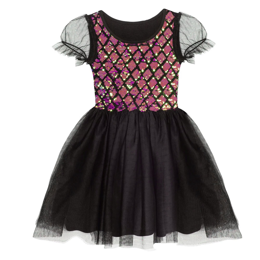 Turn every moment into a magical one with the Black Sequin Diamond Mesh Dress. Featuring a dazzling sequin diamond pattern bodice in shimmering pink and gold tones, this dress is perfect for little girls who love to shine. The fluttery mesh sleeves and full black tulle skirt add extra elegance and twirl-worthy flair.