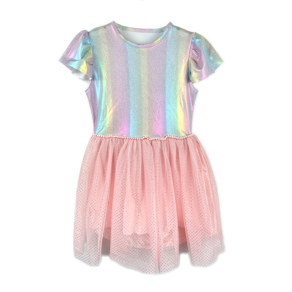 Bring out the sparkle in your little one with this dazzling Rainbow Shine Glitter Tulle Dress. The iridescent rainbow top shimmers with every movement, while the soft pink mesh skirt sparkles with scattered glitter, creating a magical and playful look. A delicate pearl-like trim at the waist adds a sweet finishing touch.