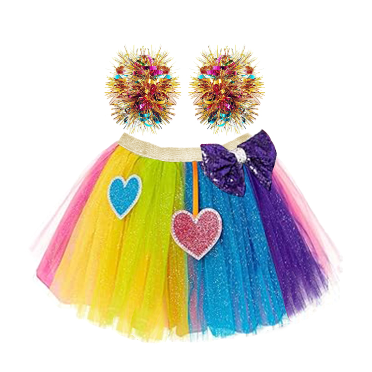 A dazzling and colorful outfit set that will make any little girl the star of the show! This set includes a vibrant rainbow - colored tulle skirt adorned with glittery heart patches and a large purple bow, along with a pair of sparkly, spiky hair accessories. Perfect for parties, performances, or dress - up play, this set is sure to bring joy and excitement.