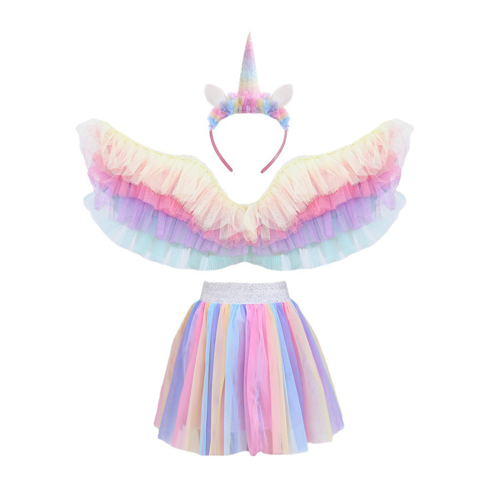 Bring fantasy to life with this dreamy rainbow unicorn costume set. The outfit includes layered pastel fairy wings with soft ruffles, a matching multicolor tutu skirt, and a unicorn headband complete with glitter horn, ears, and tulle flowers. Perfect for every little one who dreams of magic, this set makes dress-up dazzling and unforgettable.