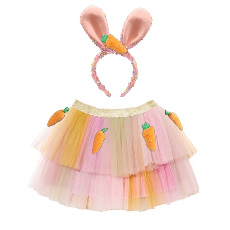 Hop into adorable fun with this charming pastel bunny costume set. The fluffy layered tutu skirt features soft tulle in gradient pastel shades, decorated with cute carrot appliqués. Paired with a pink bunny ear headband embellished with sparkly sequins and a plush carrot accent, this outfit is perfect for little ones who love Easter, animals, or pretend play.