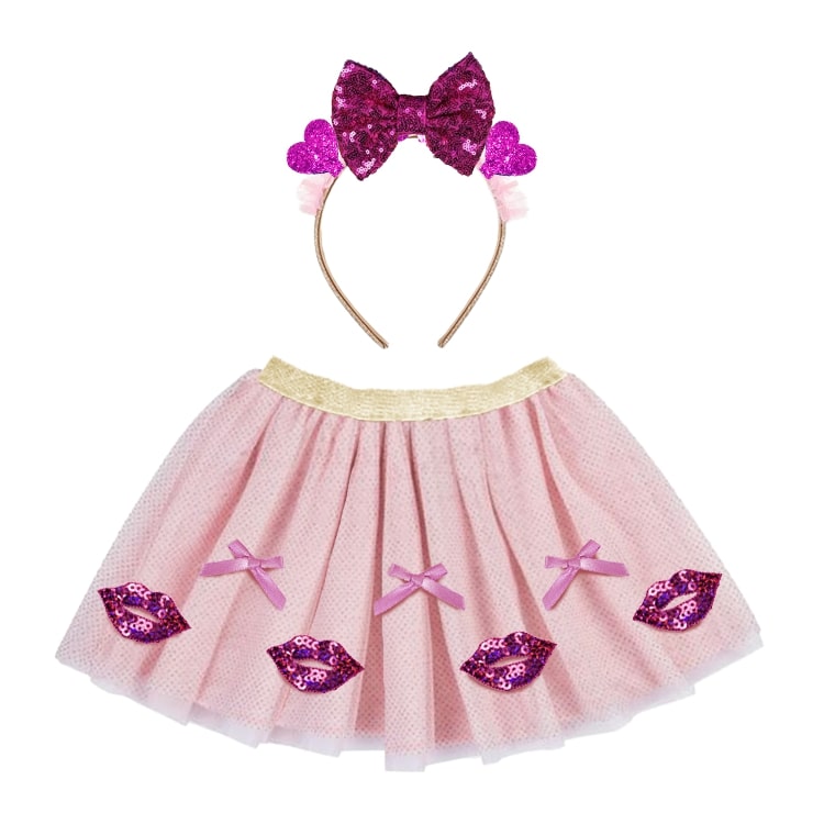 Girls Pink Sequin Lips Tutu Skirt & Glitter Bow Headband Set