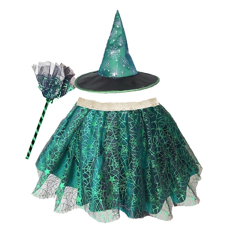 Cast a stylish spell with this enchanting 3 piece witch costume set for girls. Featuring a glittery green spiderweb skirt, a matching pointed witch hat, and a playful mini broom with mesh accents, this costume is both whimsical and magical. Perfect for dress up fun or spooky celebrations.