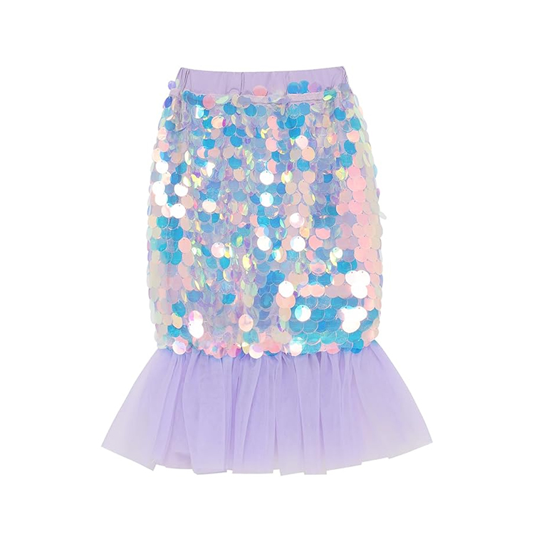 This charming skirt for kids is designed with a mermaid - inspired aesthetic. The upper portion is densely covered with iridescent sequins in shades of blue, pink, and purple, creating a dazzling, scale - like appearance. The lower part features a layer of light purple tulle, adding a soft and flowing effect that mimics the movement of a mermaid's tail. The waistband is simple and likely elasticated for a comfortable fit.