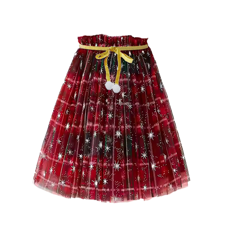 This Red Plaid Tulle Skirt with Star Pattern is a festive and eye - catching piece for young fashionistas. Made from soft, lightweight tulle, it offers a comfortable and flowing fit. The skirt features a classic red plaid design overlaid with sparkling white star patterns. A golden ribbon with a fluffy white pom - pom charm cinches the waist, adding a playful and elegant detail.