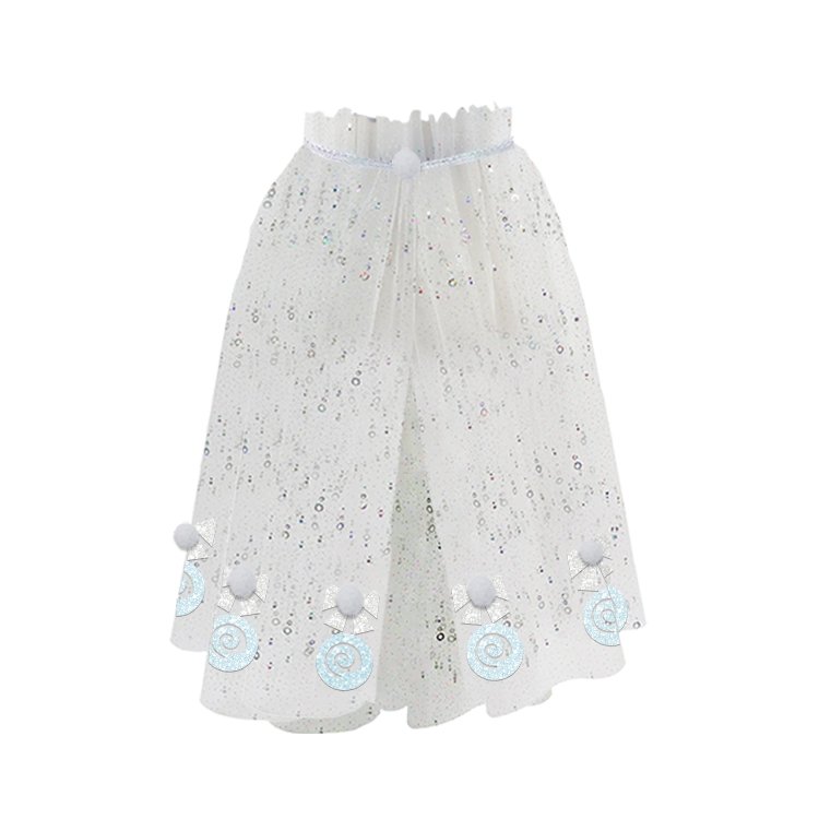 Design: Covered in shimmering sequins for a magical look, with lollipop - shaped ornaments and white pom - poms at the hem.