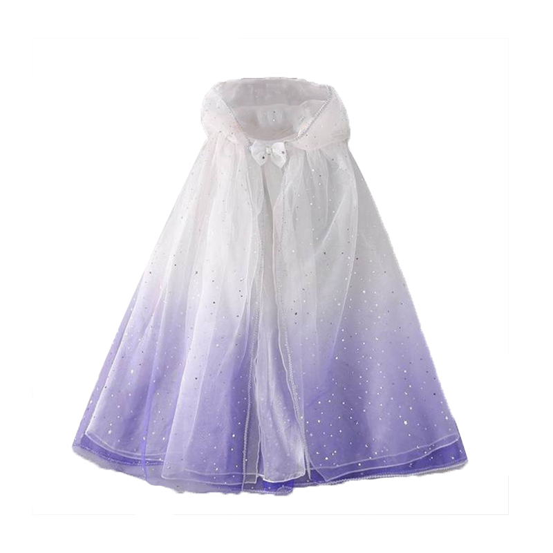 This charming kids' cloak showcases a unique color gradient that transitions seamlessly from white at the top to a soft lavender at the bottom. The entire surface of the cape is adorned with countless silver sequins, which sparkle and shine with every movement, creating a magical and dreamy effect. At the collar, there is a delicate white bowknot, adding a touch of sweetness and elegance.