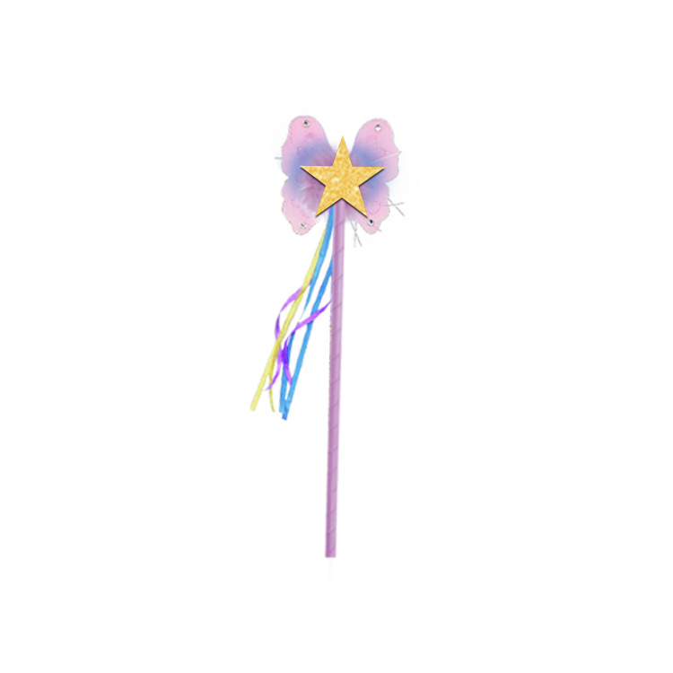 Make every wish feel magical with this Golden Star Butterfly Wand. Featuring pastel pink and purple butterfly wings, a shimmering gold star at the center, and trailing ribbons in blue, purple, and yellow, this wand brings sparkle and movement to any fantasy adventure.