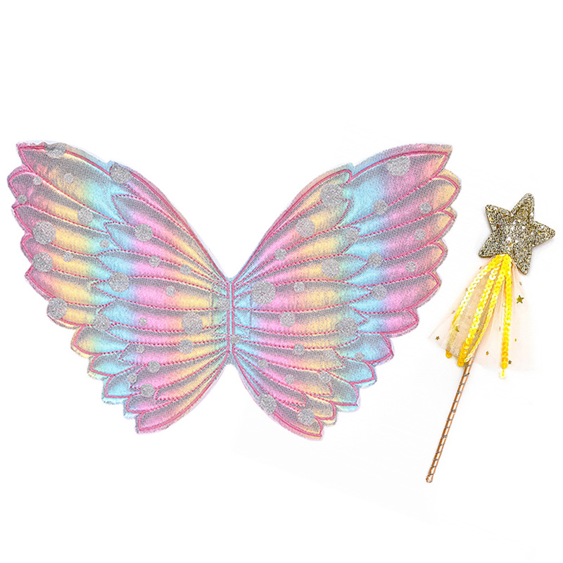 Material: The wings and wand are likely made of lightweight and durable materials to ensure that children feel comfortable when wearing and playing. The colors and silver spots on the wings may be presented through printing or embroidery processes, and the glitter on the wand adds a shiny effect.