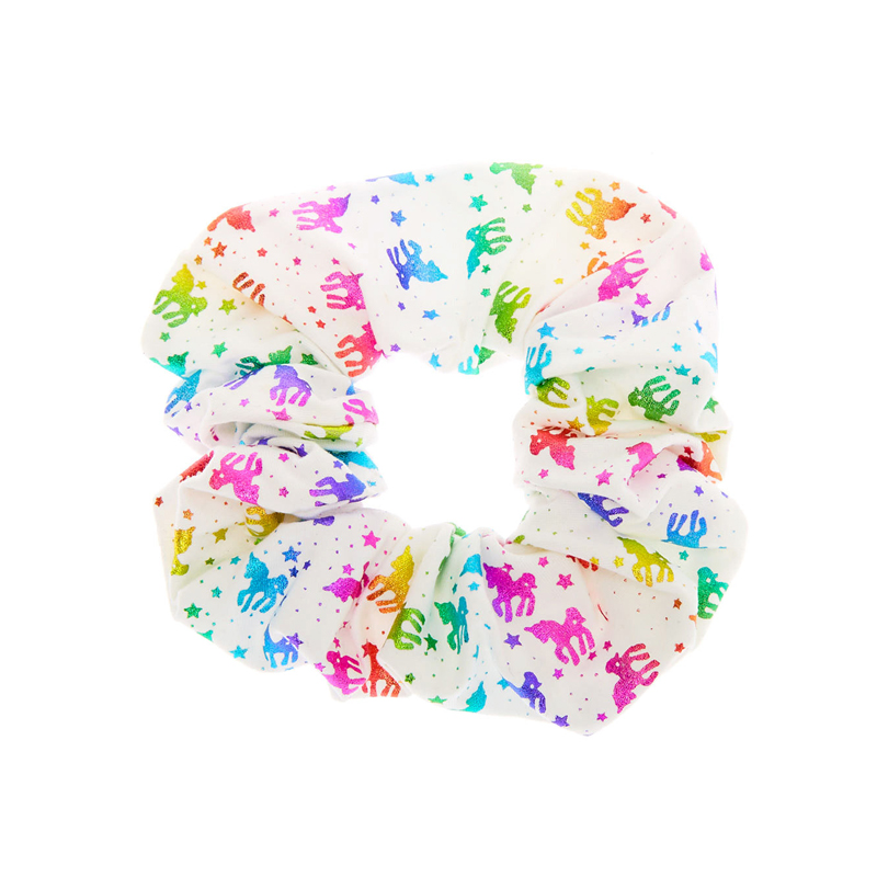 This vibrant hair accessory is perfect for adding a touch of magic to any hairstyle. The scrunchie is made of a soft, lightweight fabric in a clean white color, providing a bright base. It features numerous colorful unicorn and star prints scattered across the fabric, creating a whimsical and enchanting look.