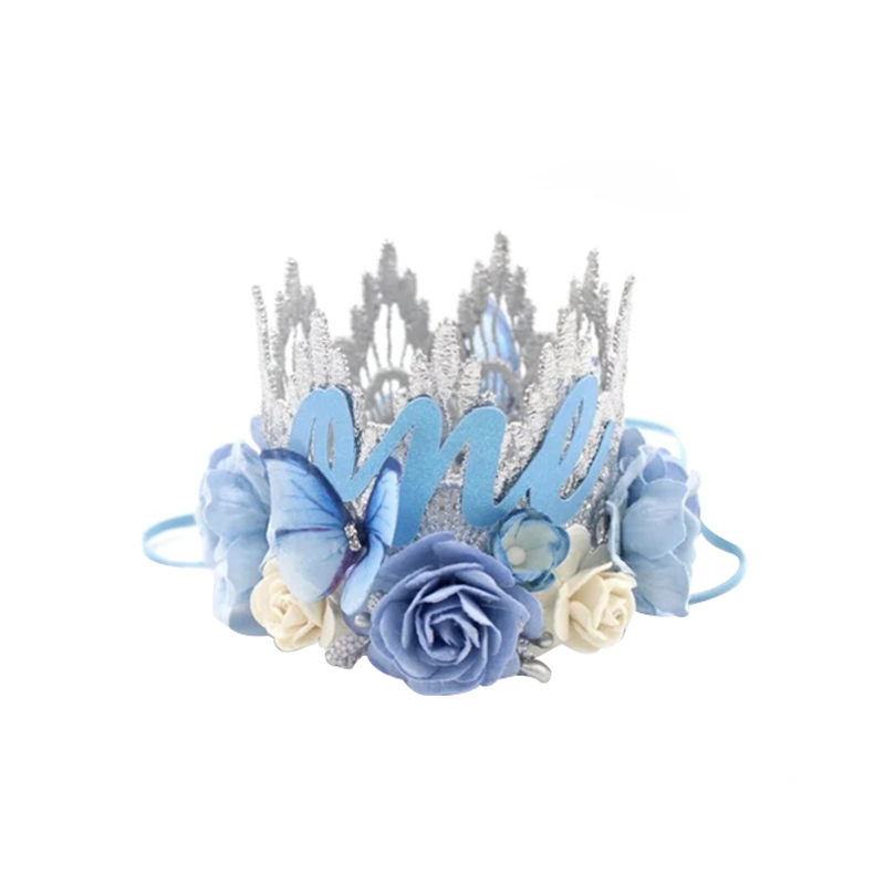 Floral and Butterfly Accents: The blue and cream fabric flowers, along with the blue butterfly, create a soft, romantic, and whimsical look, enhancing the crown's charm.