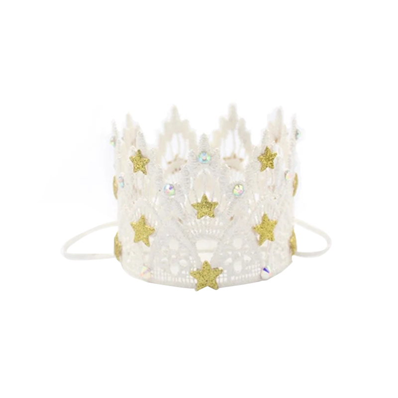 This star - adorned white lace crown is a delicate and enchanting accessory. The crown is crafted from intricate white lace, featuring a classic, regal silhouette with pointed arches. Adorning the lace are golden glitter stars, which add a touch of magic and sparkle. Additionally, small, iridescent rhinestones are scattered among the stars, catching the light and enhancing the crown's ethereal beauty. The crown is designed to sit comfortably on the head, with a soft, flexible band.
