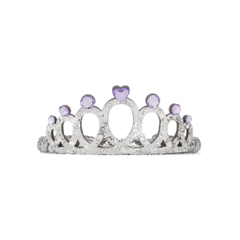 This delicate tiara is a charming accessory that combines elegance with a touch of whimsy. Crafted from silver - toned metal with a subtle glitter finish, the tiara features an intricate, open - work design with a series of arches that create a classic crown silhouette. Adorning the top of each arch is a round, purple gem, and at the center arch, there is a small, heart - shaped purple gem, adding a sweet and romantic detail. The overall design is both regal and playful, making it suitable for a variety of occasions.