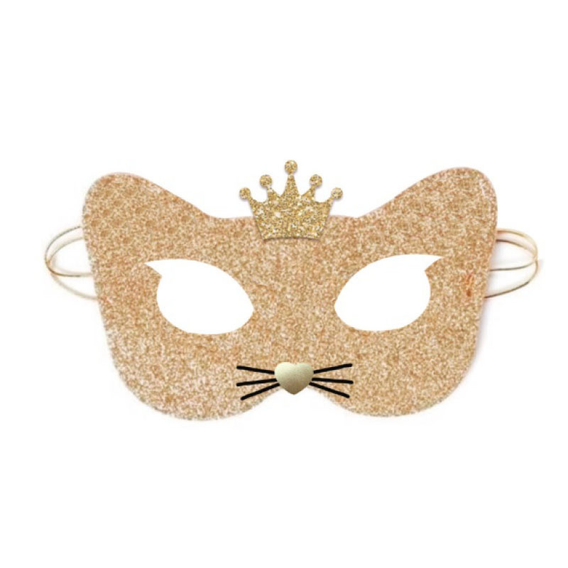 This charming cat mask is crafted from a shimmering golden glitter material, giving it a luxurious and eye - catching appearance. The mask is designed in the shape of a cat's face, with two pointed ears at the top. At the center of the forehead, just above the ears, sits a small, glittering golden crown, adding a regal touch. Below the eye holes, three thin, black lines represent the cat's whiskers, and a small, heart - shaped golden nose is positioned in the middle. The mask is attached to a thin, flexible golden band that ensures a comfortable fit.